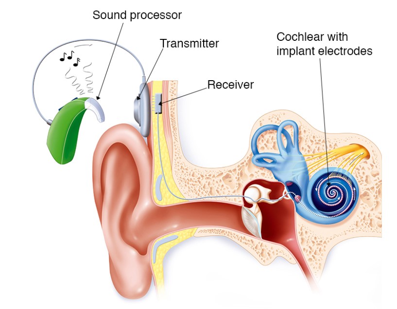A cochlear implant is a surgical procedure to implant a electronic hearing device, designed to produce useful hearing sensations to a person with severe to profound nerve deafness by electrically stimulating nerves inside the inner ear.